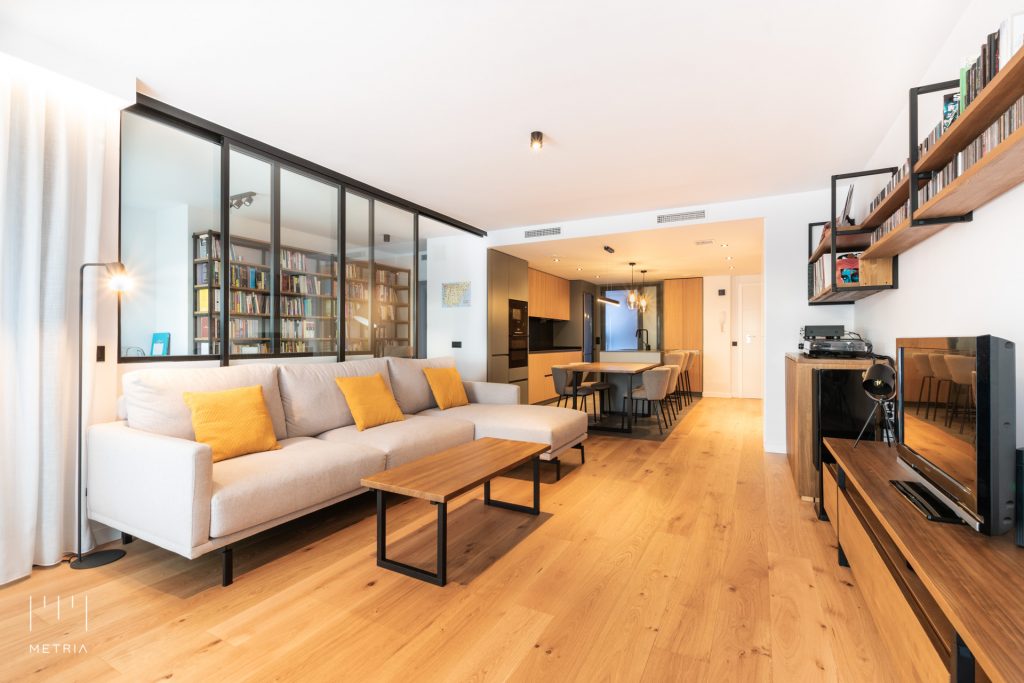Antes de la reforma, la vivienda sufría de una excesiva compartimentación. La separación original entre la cocina y el salón no solo bloqueaba la entrada de luz natural, sino que anulaba cualquier conexión entre ambos espacios. Además, la distribución obligaba a transitar desde la entrada por un pasillo largo y angosto que asfixiaba visualmente el recorrido. A este reto espacial se sumaba una petición clave de los clientes: necesitaban una zona de trabajo que dialogase con las estancias principales de la casa, pero que al mismo tiempo garantizara silencio y privacidad. El objetivo de nuestro diseño estaba claro: abrir, conectar y dejar que la luz fluyera.