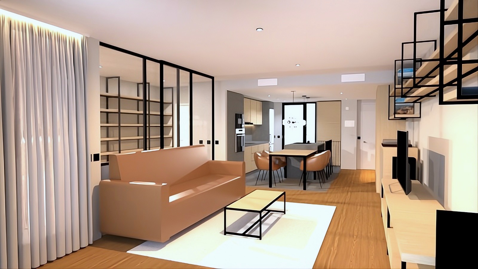 Nuestro diseño maximiza la fluidez espacial, comenzando en el “corazón de la casa”: un gran área de día de concepto abierto donde salón, comedor y cocina dialogan sin barreras. El salón se define por un mueble a medida que oculta el radiador y también sirve de base para el tocadiscos, integrando una estantería a juego que expone la extensa colección de vinilos. Todo este conjunto queda enmarcado visualmente por el cerramiento de cristal del estudio, que conecta visualmente las estancias sin perder amplitud. Dentro de este estudio, una imponente estantería modular de suelo a techo aloja una preciada biblioteca, junto a un rincón de lectura perfecto y un área de trabajo amplio y luminoso.